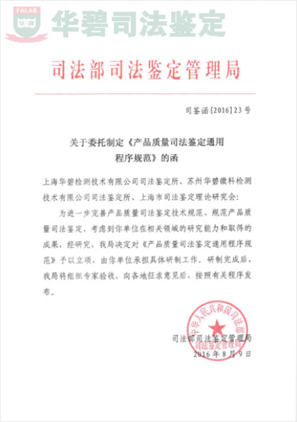 In order to further improve the technical specifications of product quality forensic appraisal and standardize product quality forensic appraisal, the Judicial Appraisal Administration of the Ministry of Justice formally entrusted Shanghai Huabi Testing Technology Co., Ltd. Forensic Appraisal Institute, Suzhou Huabi Microtechnology Co., Ltd. and Shanghai Forensic Appraisal Theory Research Association to work together. The organization has developed the general procedure standard for judicial authentication of product quality. The procedure specification is the first technical specification in the field of product quality forensic identification.